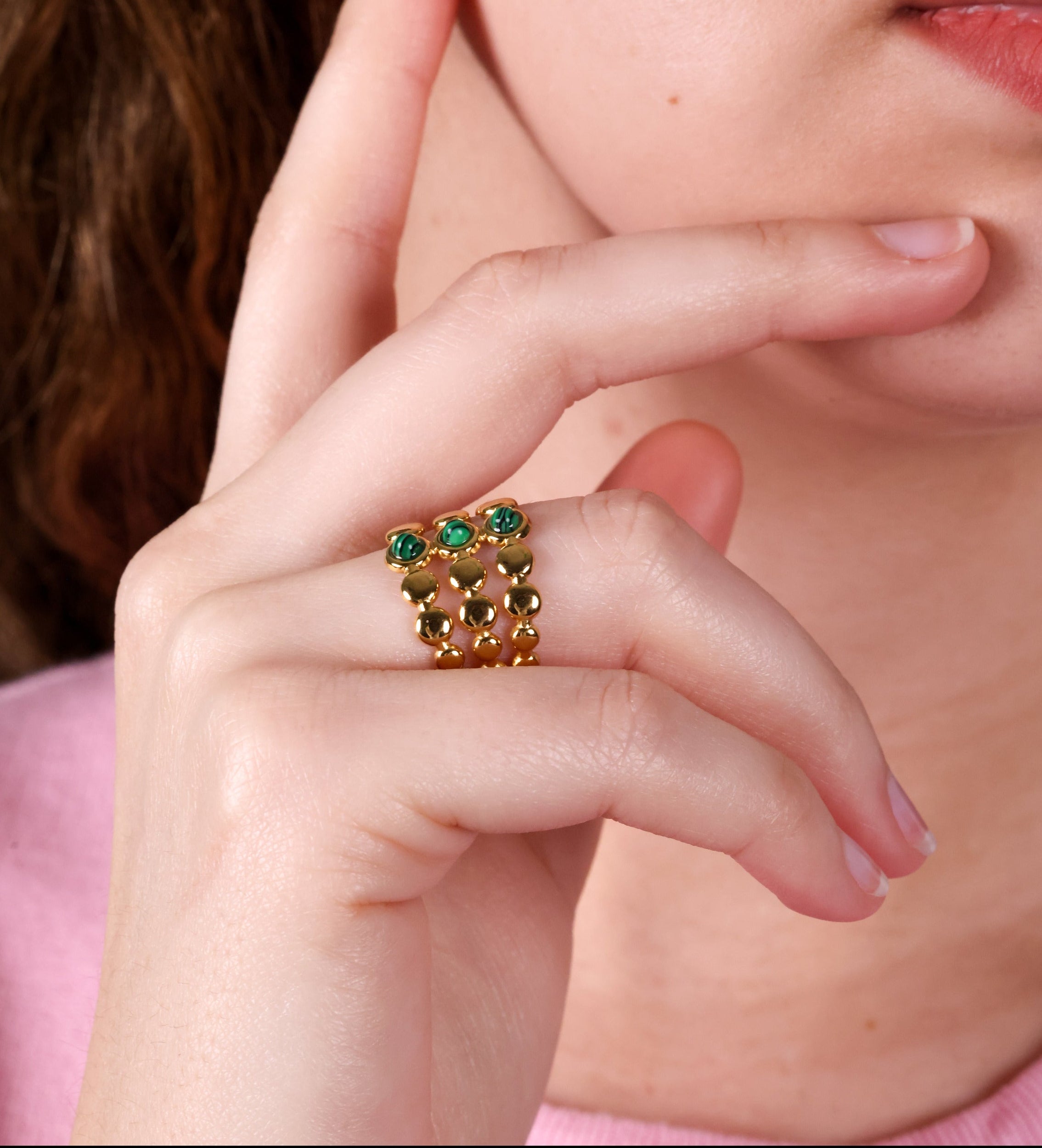 Featuring three deep green malachite stones in a tiered gold band, this statement ring adds bold, sophisticated allure to any outfit.