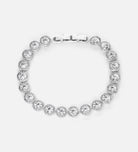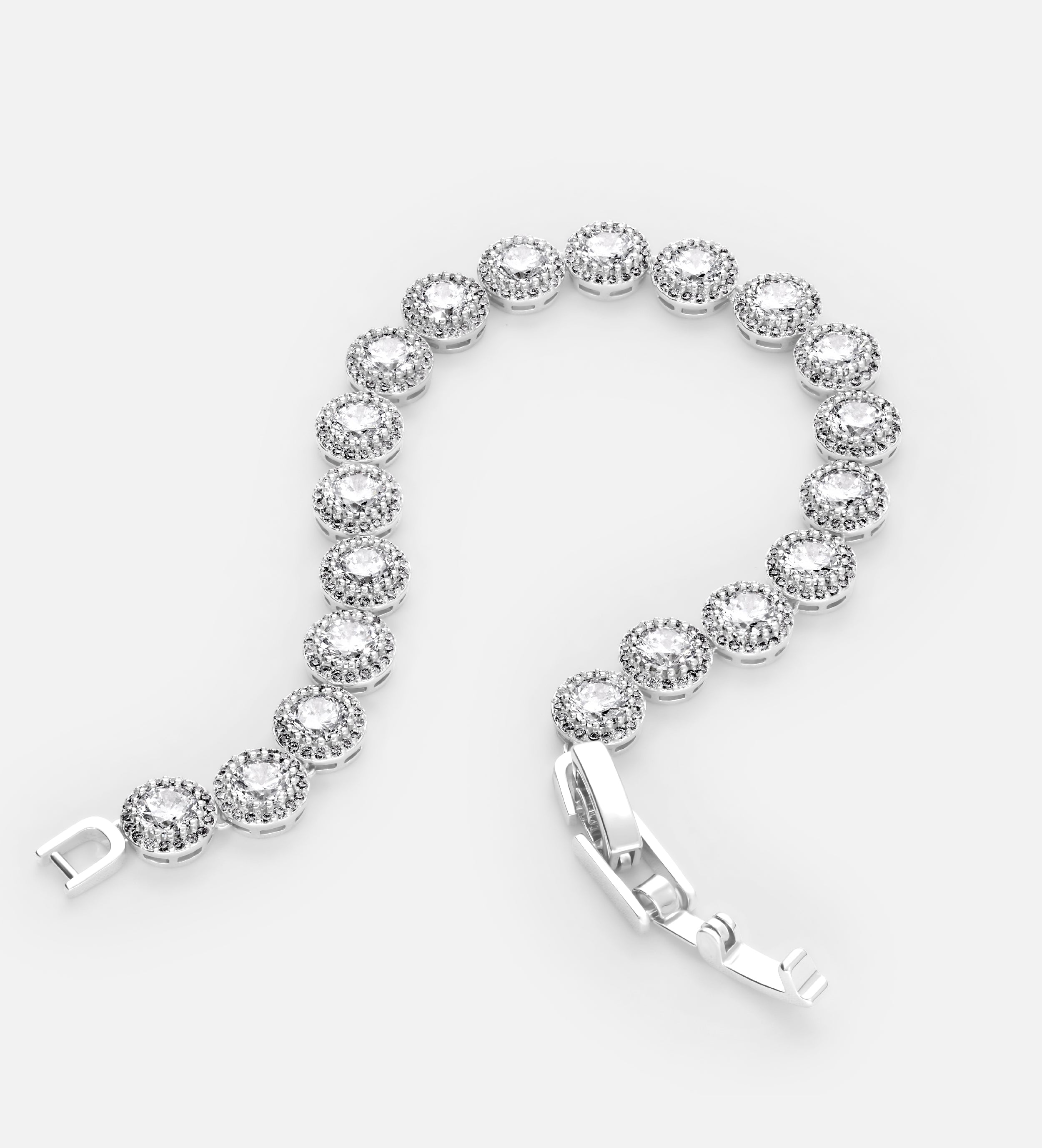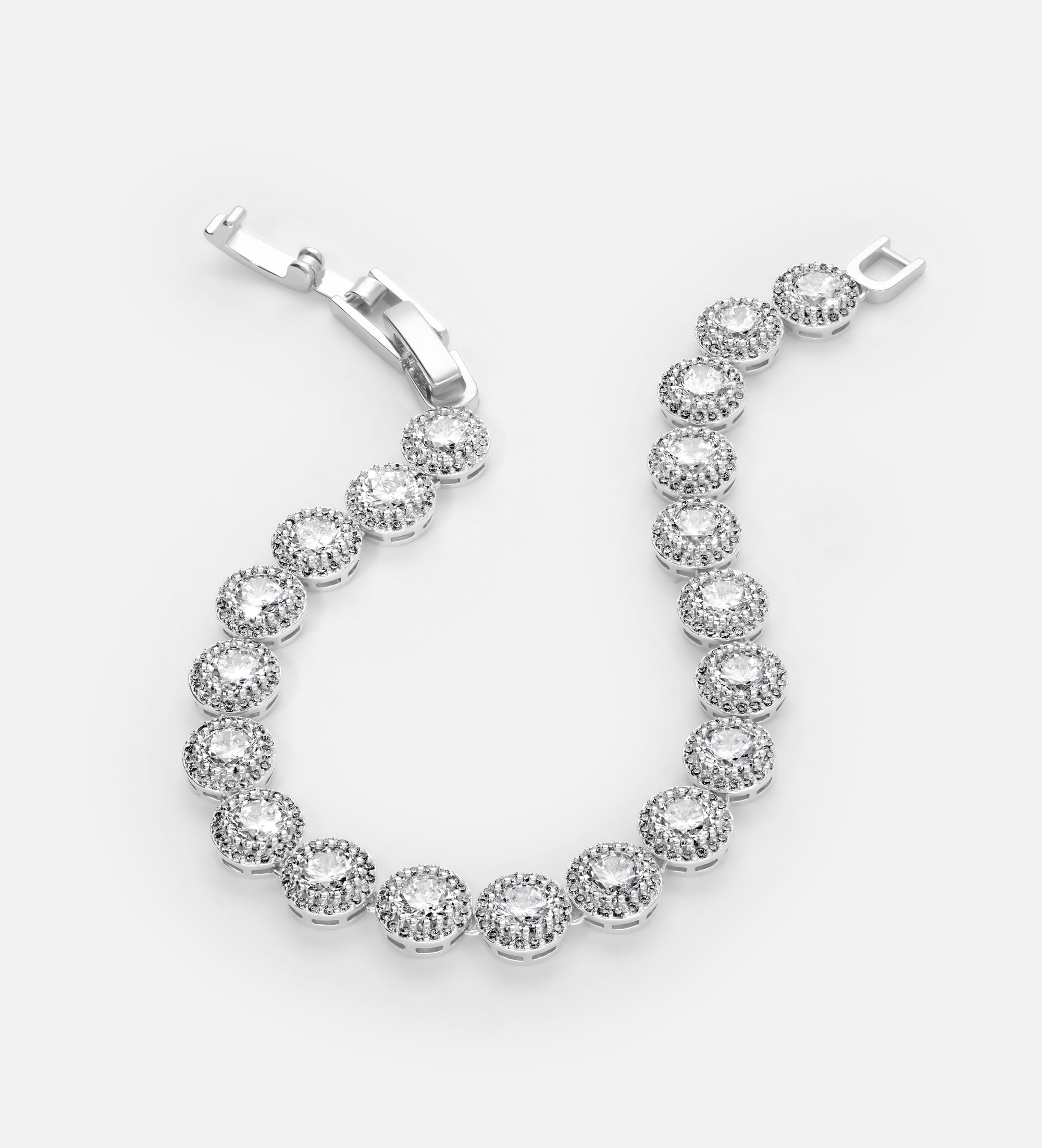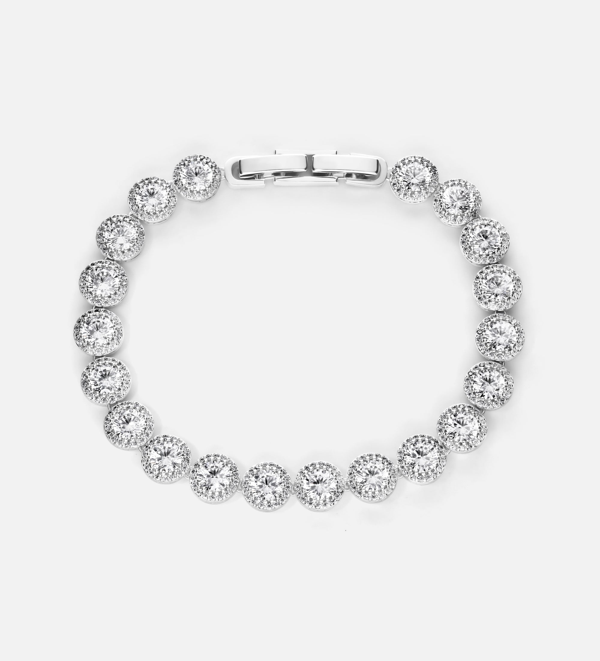 Not your average tennis. A line of round, halo‑set stones that curve perfectly around your wrist.