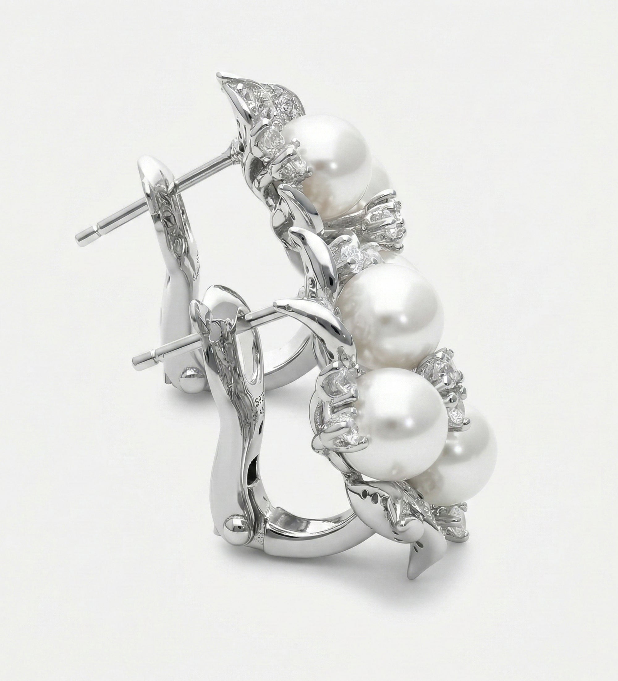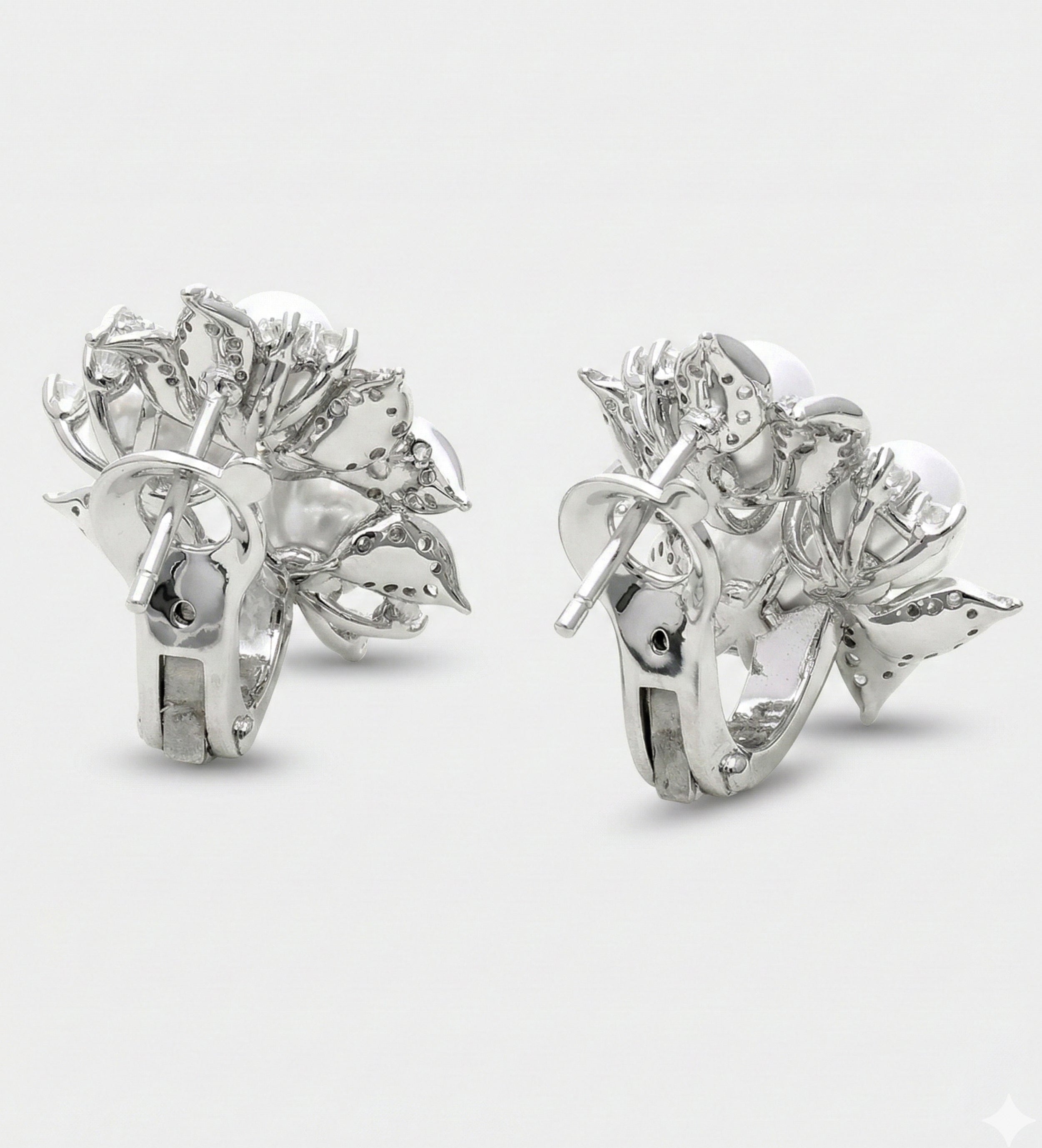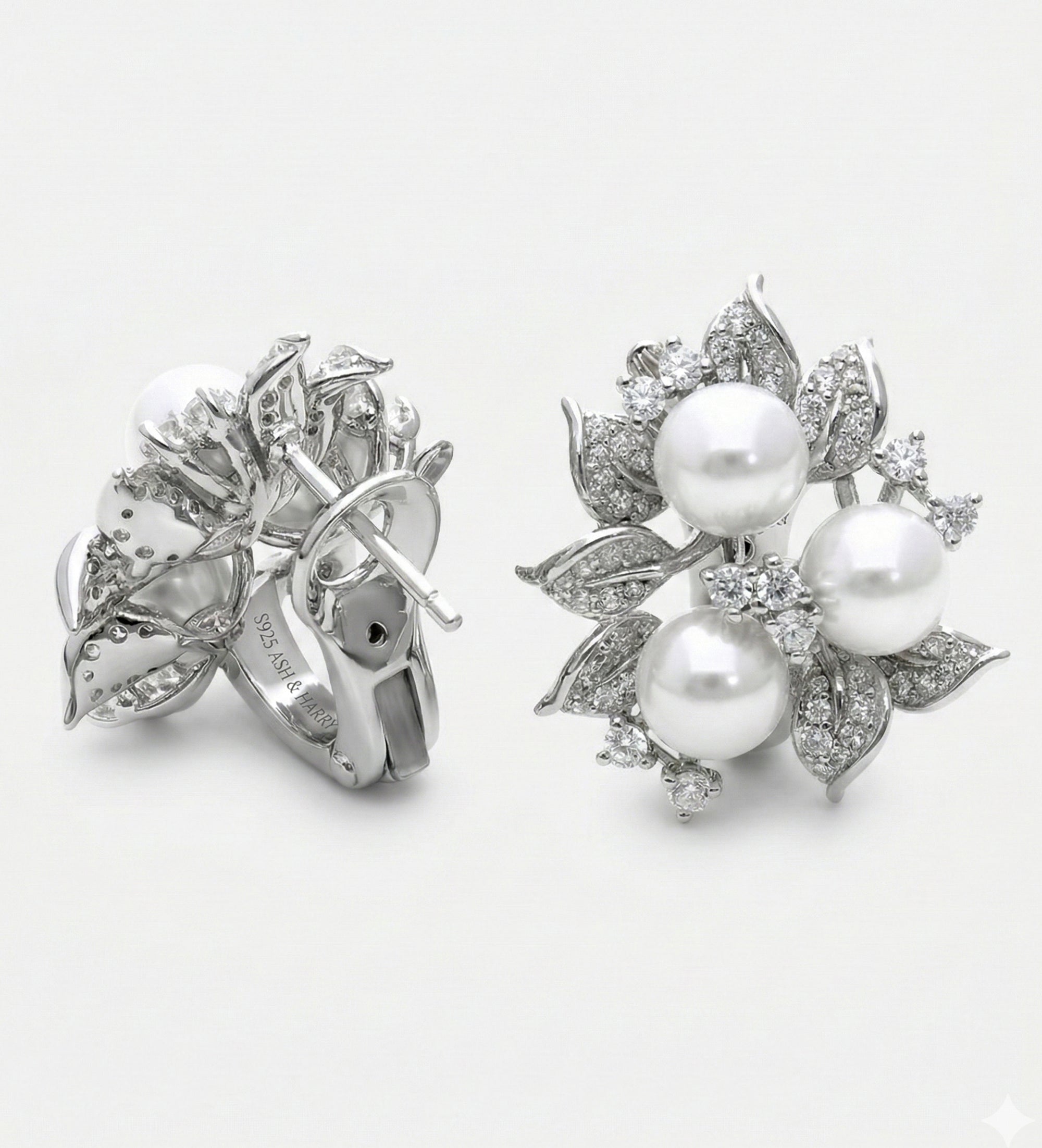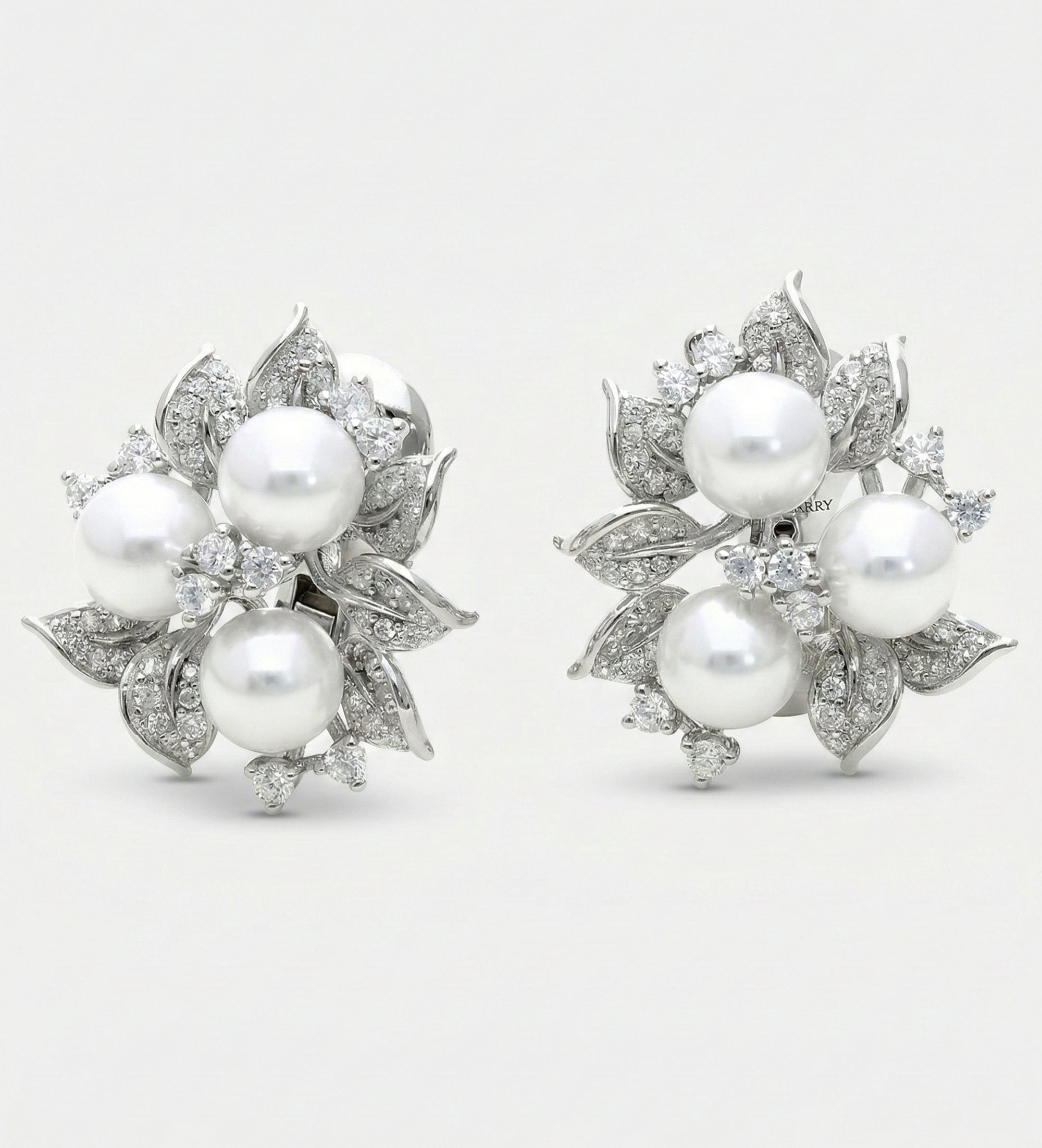 Trio Pearl Bloom Studs With Fresh Water Pearls and High Quality Simulated Diamonds in 925 Silver