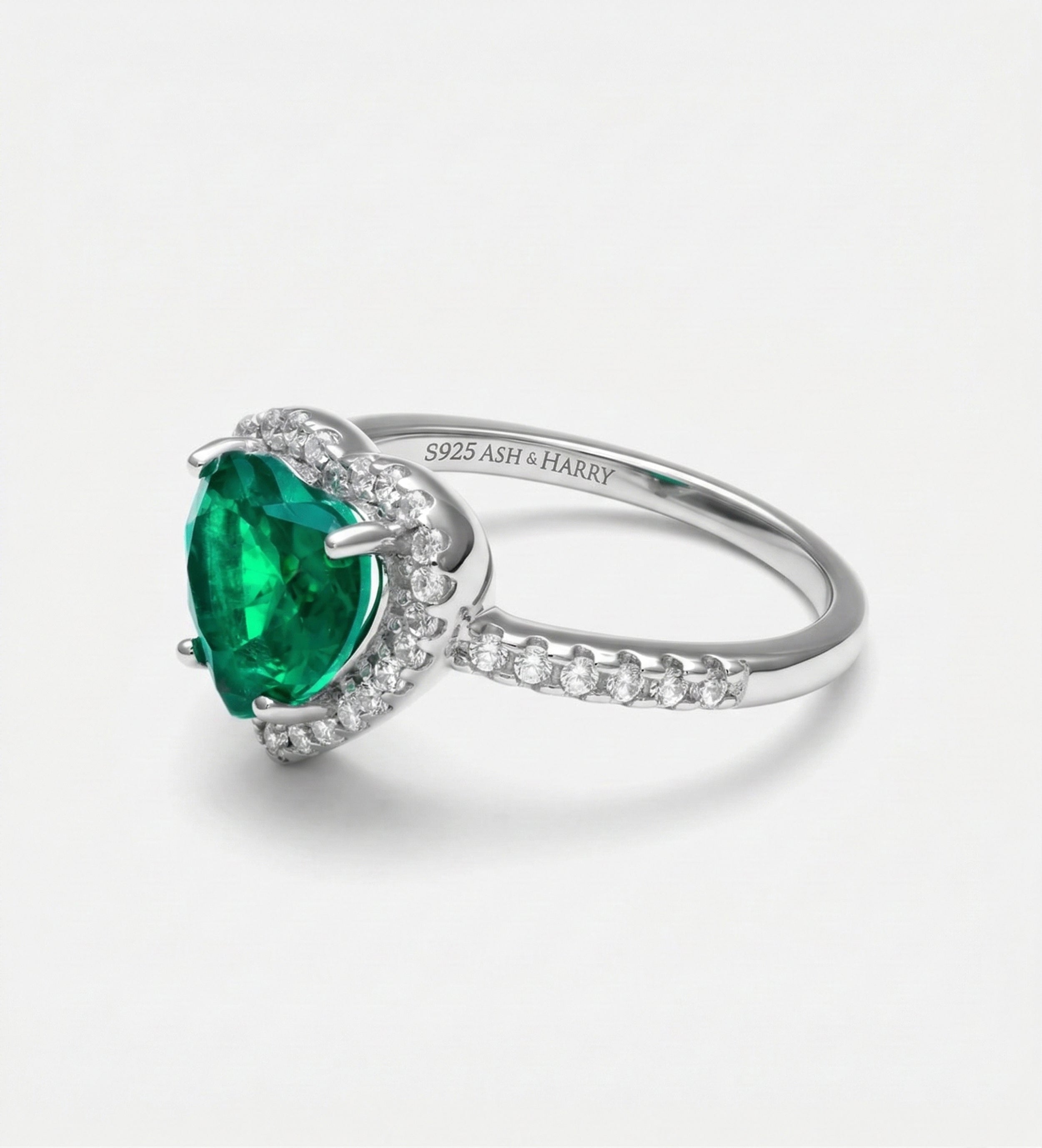 INSCRIPTION GUIDE - Emerald Heart Majesty Ring in 925 Silver High Quality Simulated Diamonds and Crafted Heart-Shaped Emerald Stone