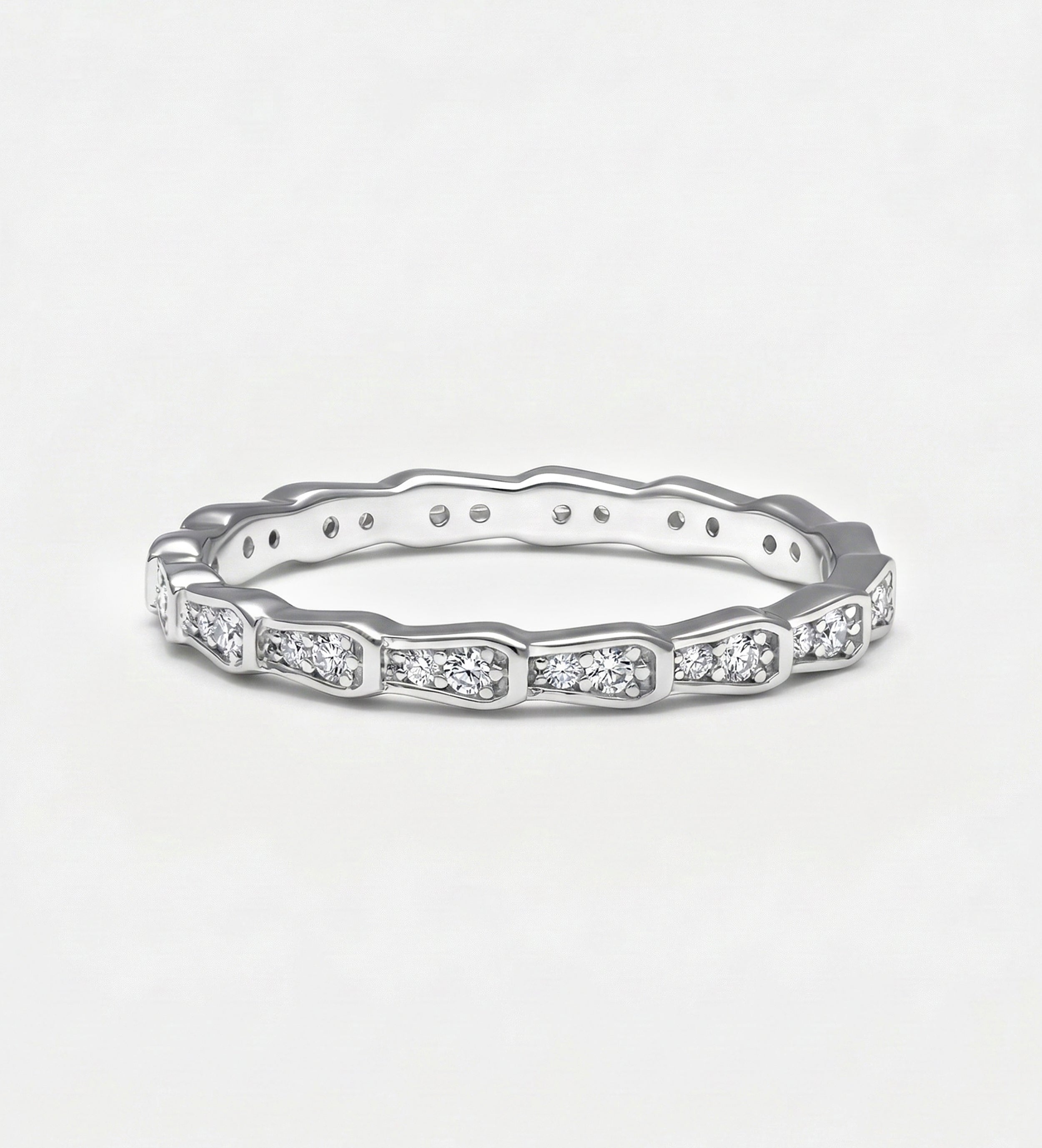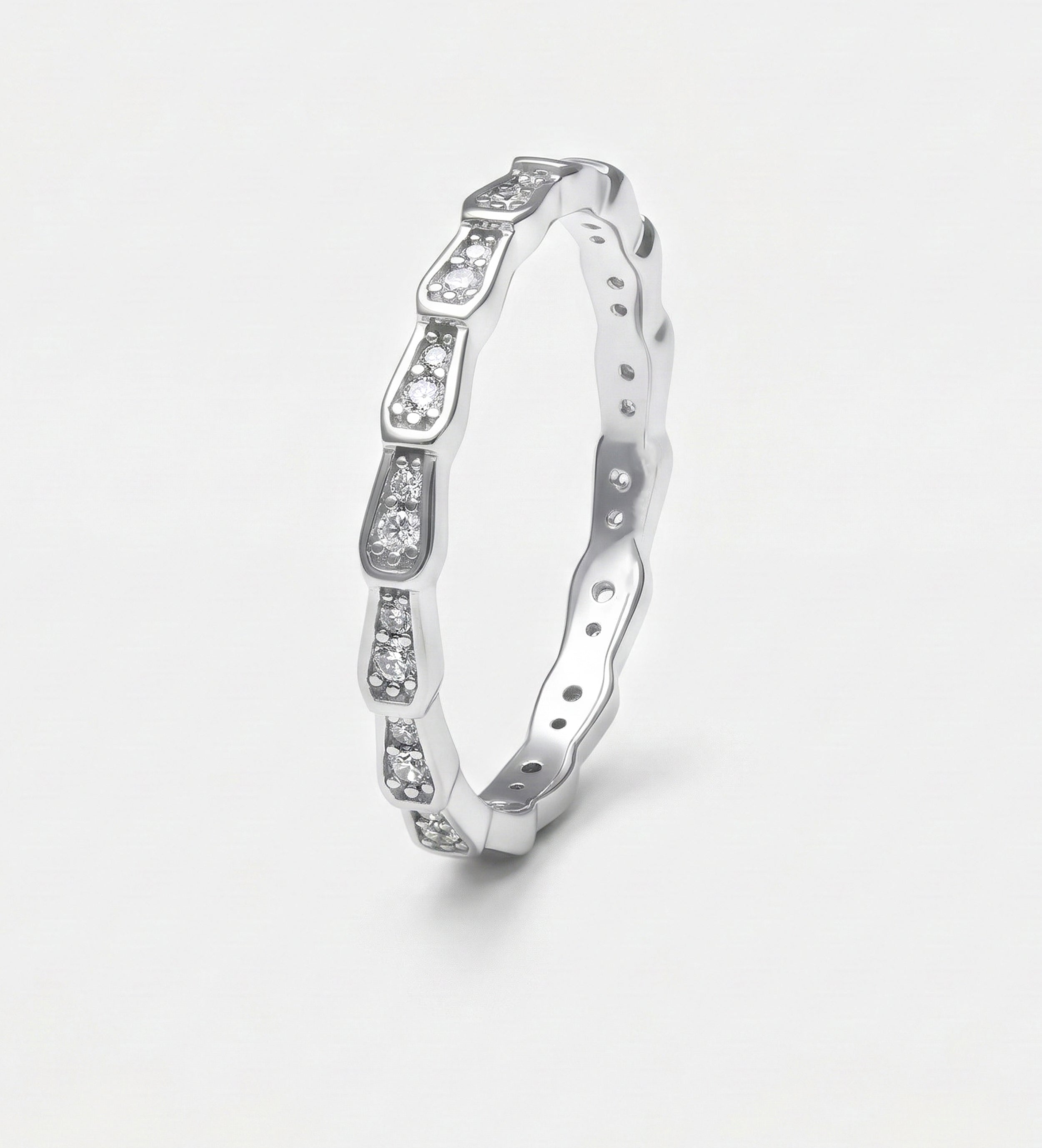 Brilliant-cut pavé simulated diamonds aligned for maximum surface sparkle. Clean finish, seamless stacking, everyday luxury without bulk.