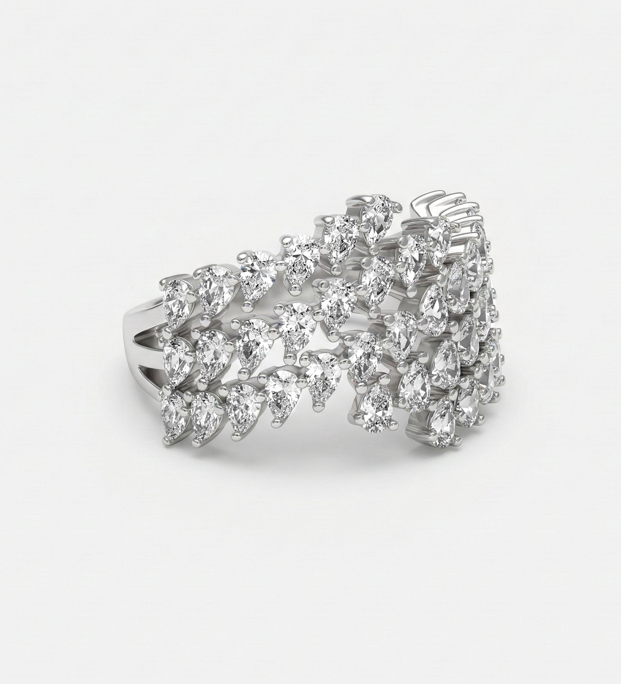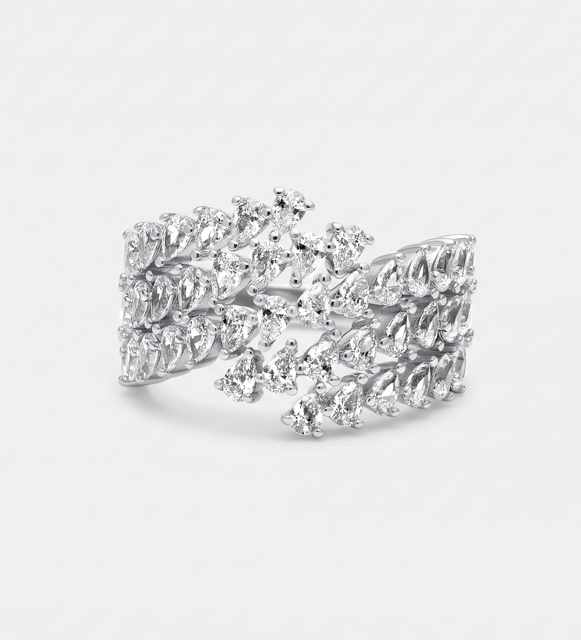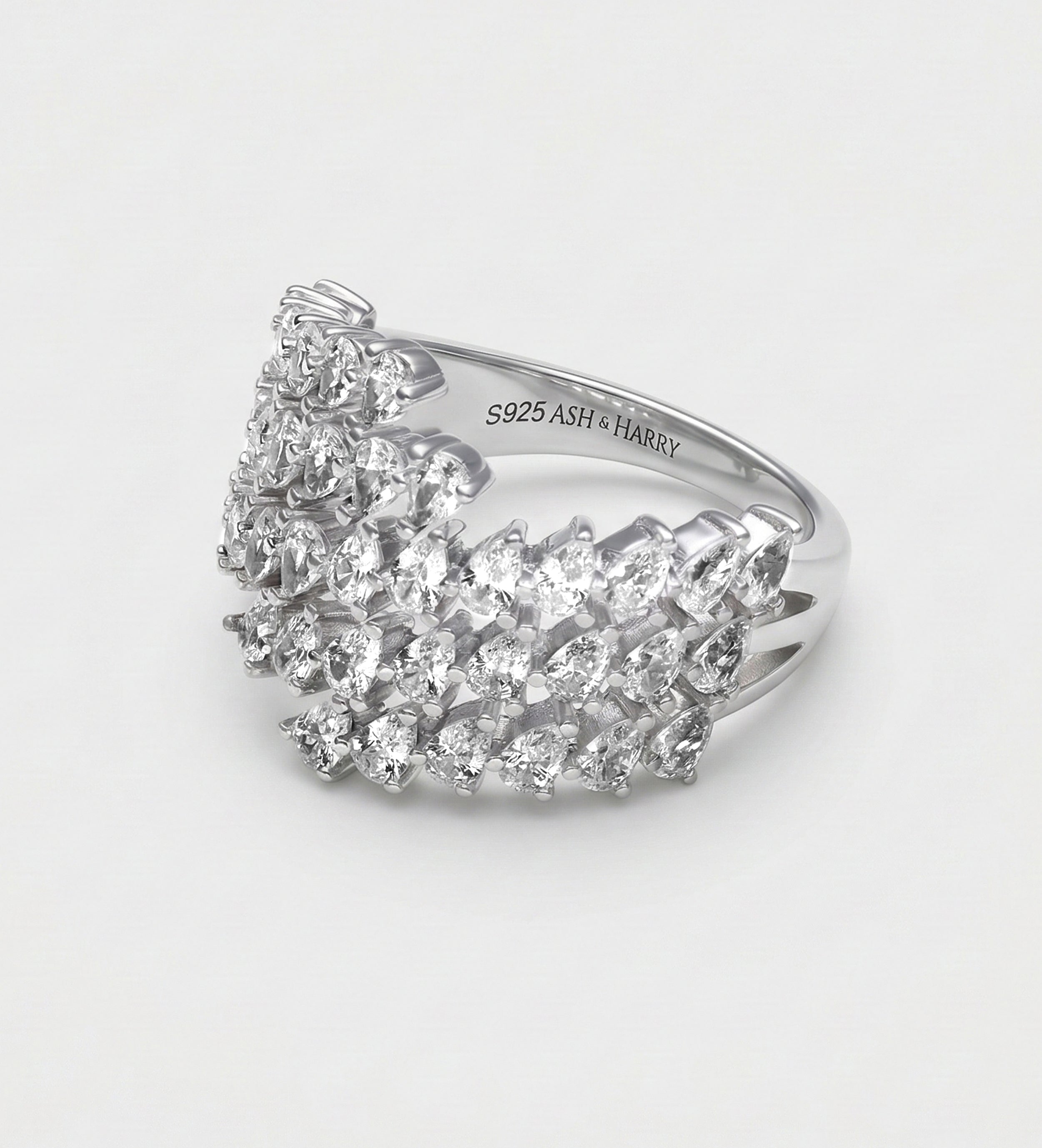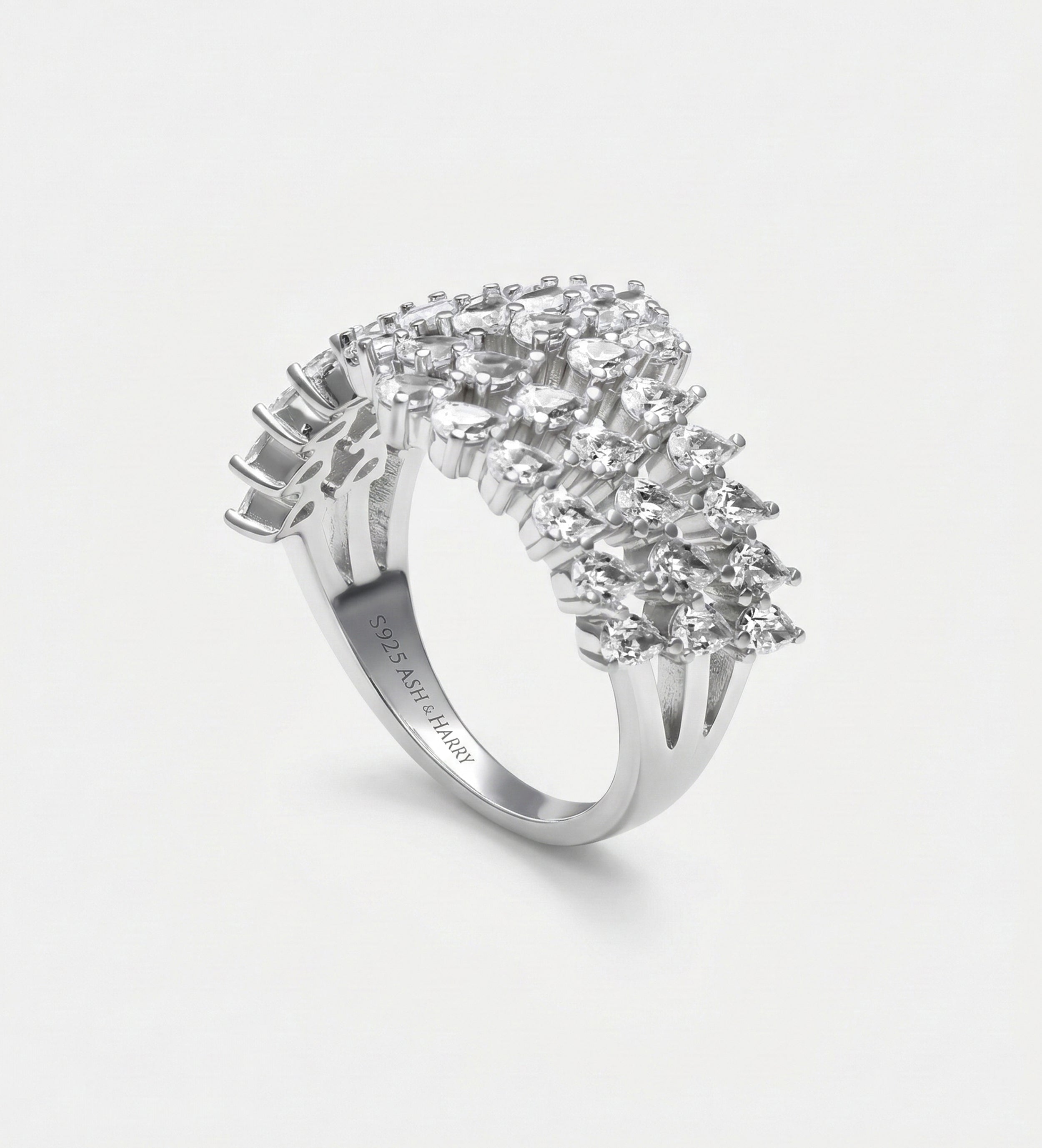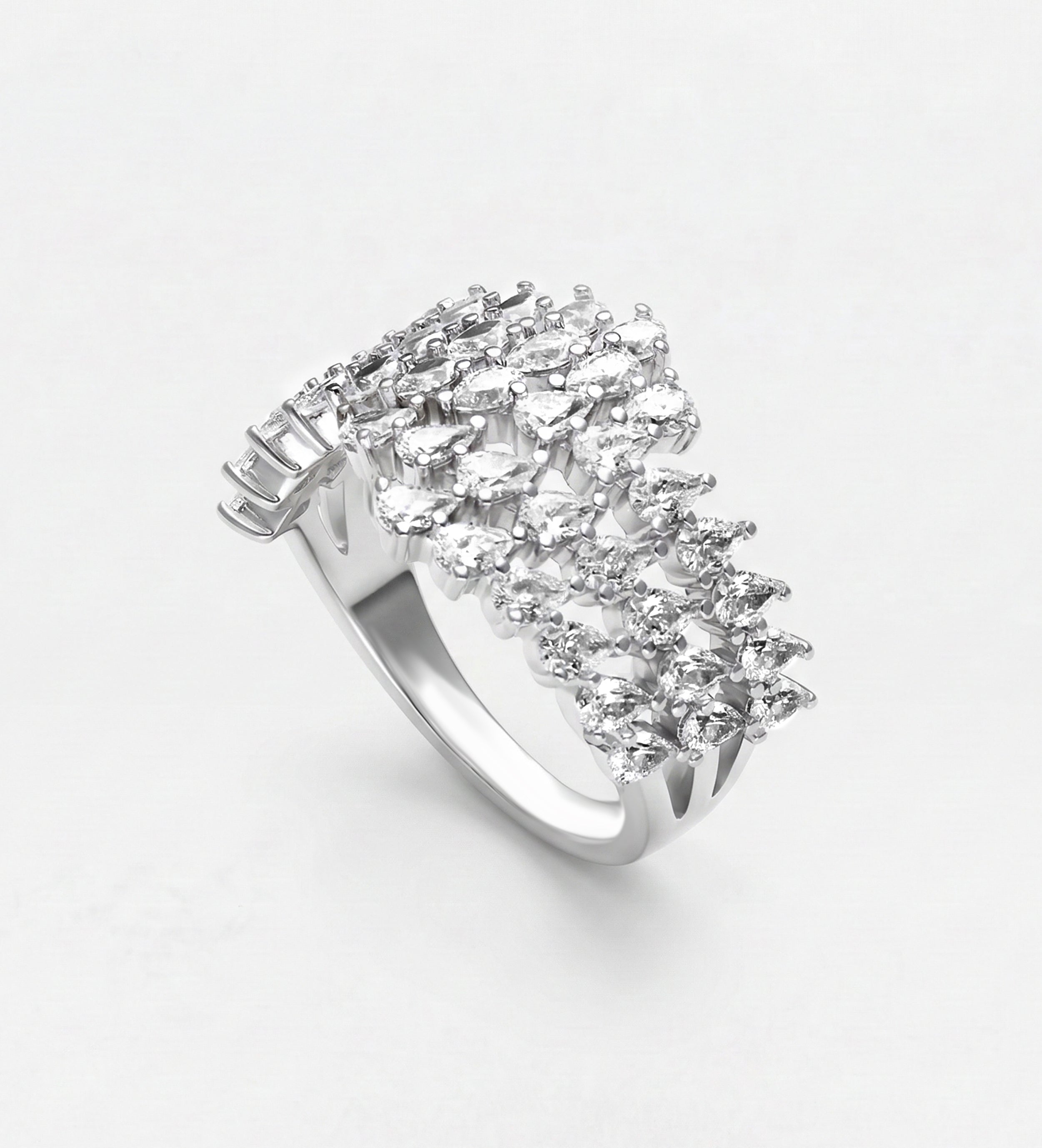A statement ring featuring rows of sparkling cubic zirconia set in 925 sterling silver. Perfect for adding bold elegance to any look, this eye-catching piece is ideal for special occasions or stylish everyday wear.