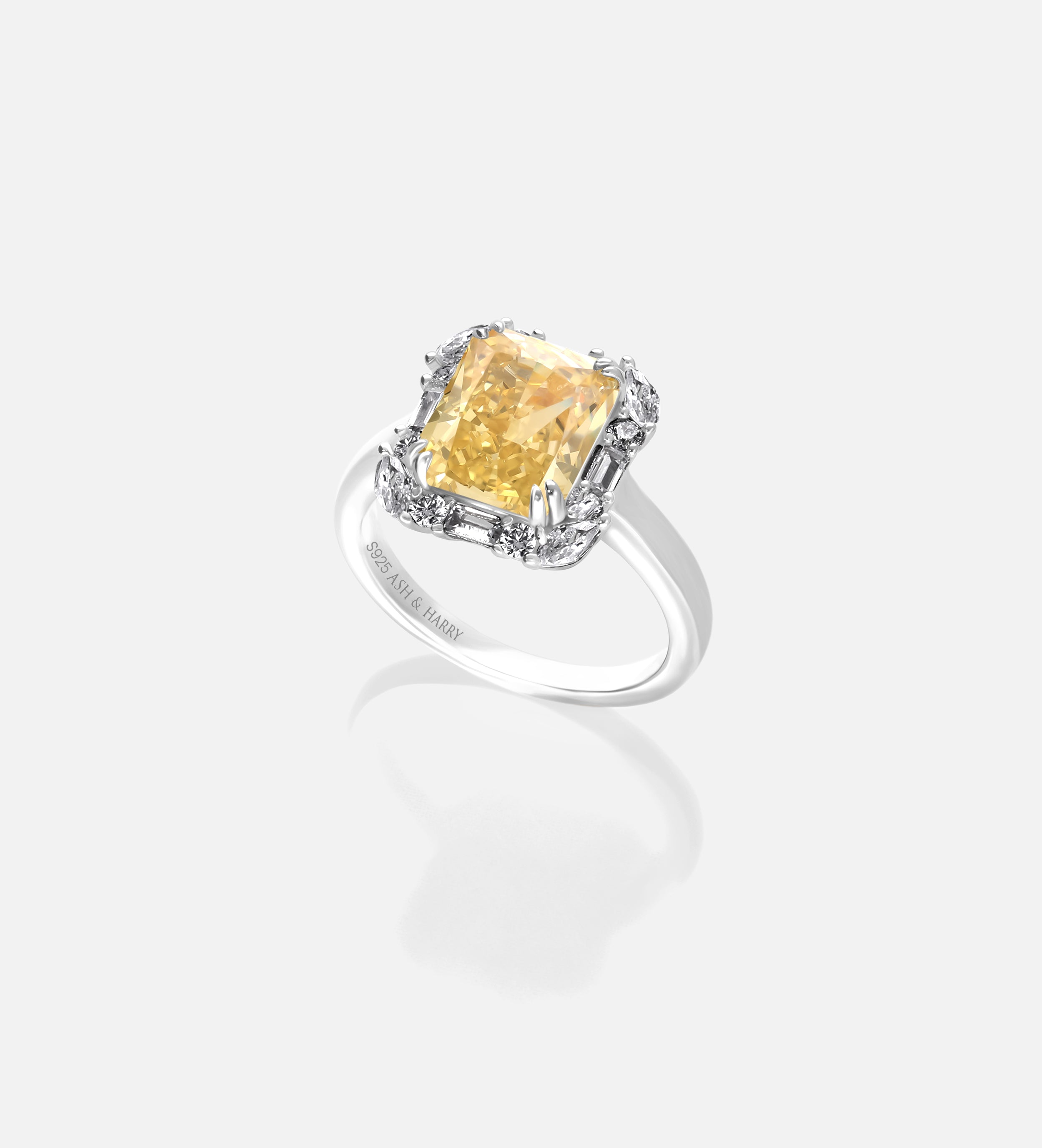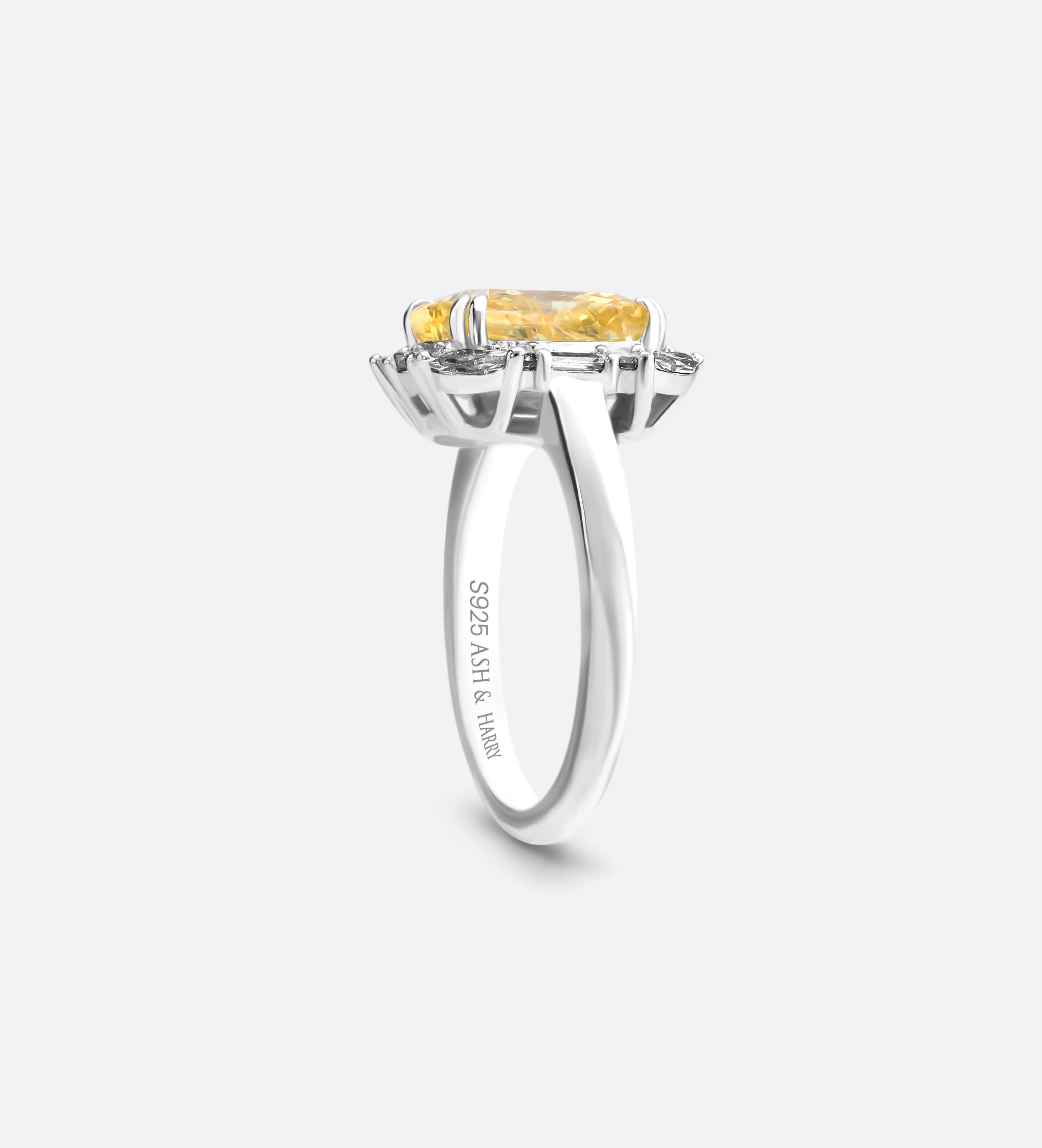 INSCRIPTION GUIDE - Sunset Halo Ring in 925 Silver with High Quality Simulated White and Crafted Canary Diamonds